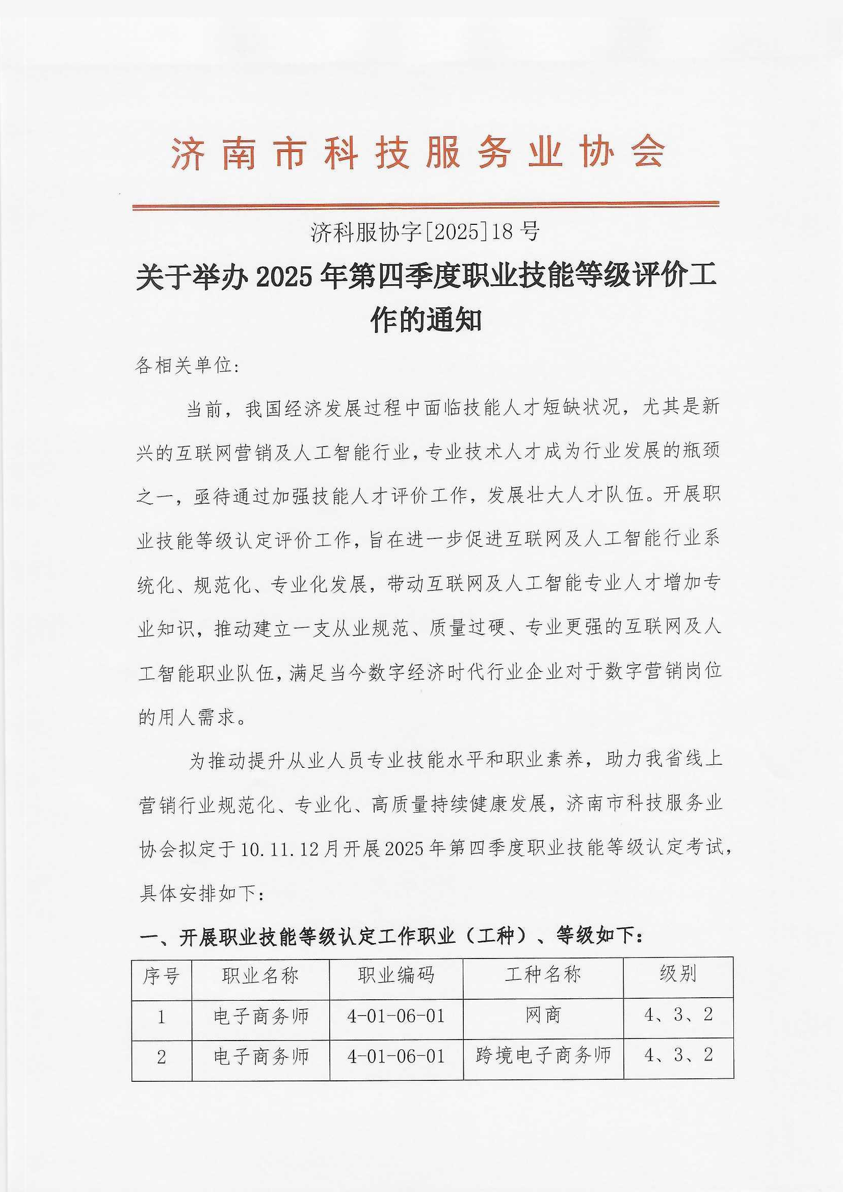 济南市科技服务业协会关于举办2025年第四季度职业技能等级评价工作的通知